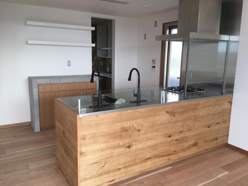 オーナー様こだわりの品を取り入れ、ステンレストップでカッコよくまとまったキッチンカウンターと海外ドラマに出てきそうな真っ白な造作棚、存在感のあるモールテックスカウンターがお洒落なキッチン。明るいリビングで料理も楽しくなりそうです。
