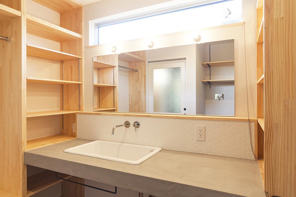 広々とした洗面スペースはハイサイドに滑り出し窓で採光と通風を。 両サイドには収納棚を製作。正面は大型ミラーで奥行が出て広々と。ハリウッドランプでホワットした雰囲気に。 天板はモールテックスにてコーティング、腰壁シロタイルは可愛い形をした名古屋モザイク。蛇口は輸入品。 トイレ洗面陶器は平田タイル、水栓などパーツひとつとってもこだわりです。
