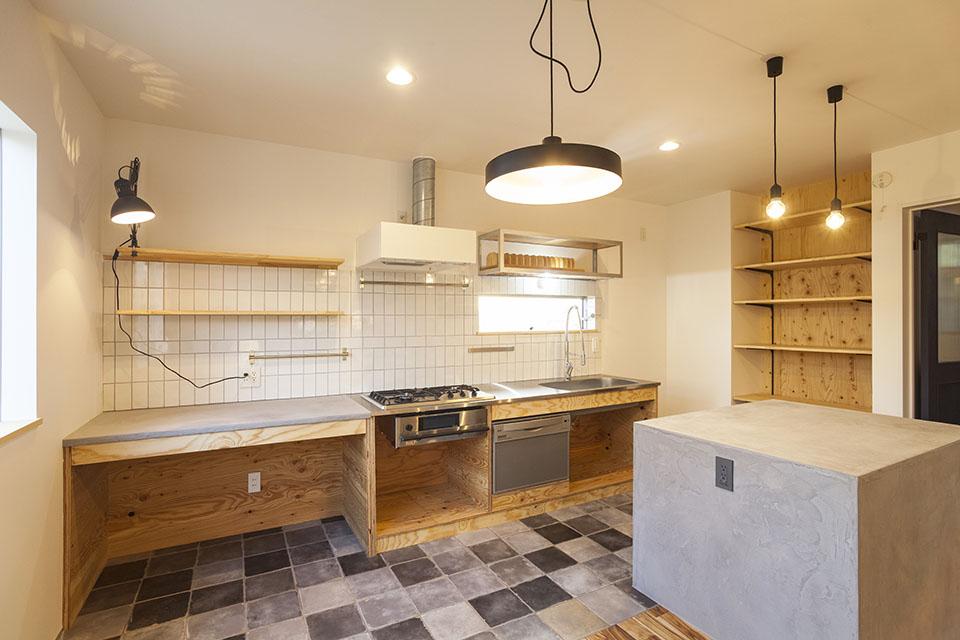 キッチンは完全なるオーダーメイド仕様。ひとつひとつ図面を書き起こし施行まで行いました。モルタルのアイランドキッチッンはベルギーのモールテックスを使用。水に強く強度が高いのが特徴。床はグレーミックスの輸入タイル貼り。吊り棚はフレームから製作。シンクと合わせてシルバーに塗装し統一感を出しています。吊り棚内部は水に強い無垢材を使いハンドクラフトにてお皿立てを作りました。蛇口は海外ブランド、ガスコンロはハーマンから取り寄せ施工。