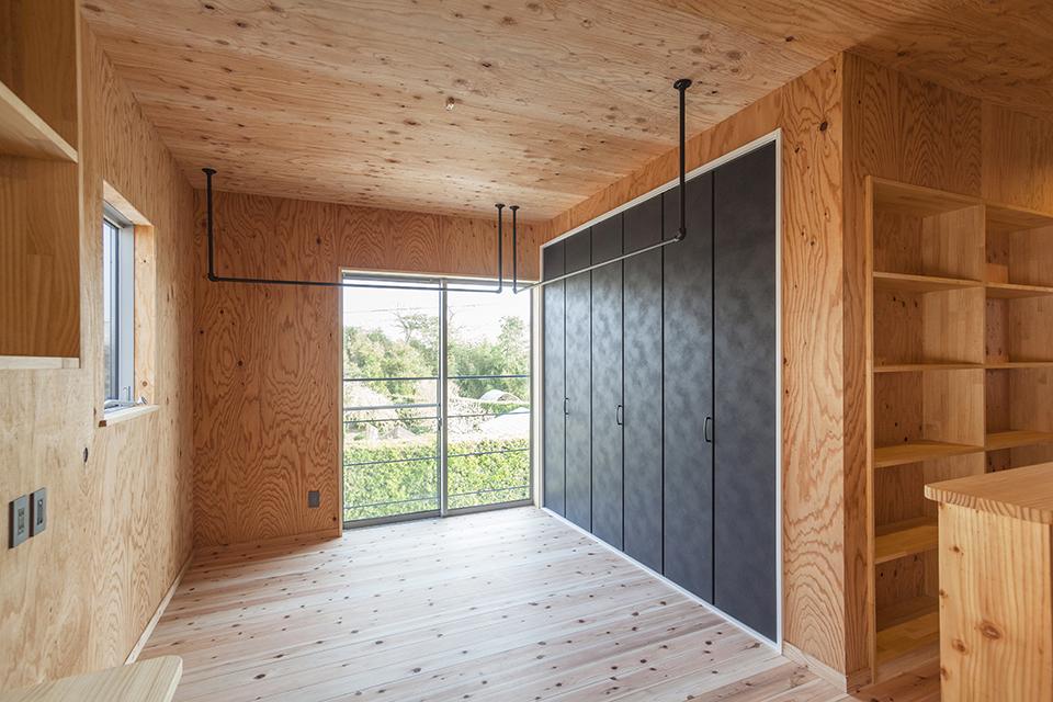 二階南東側は家族のフリースペース。読書やデスクワークをしたり各々が寛げる場所。洗濯物を干す事が出来るバーを設置し、帰りが遅い日などは部屋干しをする事が可能。ファミリークローゼットを作り家族の洋服も収納出来ます。扉はビンテージ風な折戸を選択。壁には大容量の本棚を設置。階段スペースと合わせて多くの本を収納する事が出来ます。フリースペースや階段廻りは針葉樹の板張りで統一。階段からフリースペースはウッディな空間が広がる。